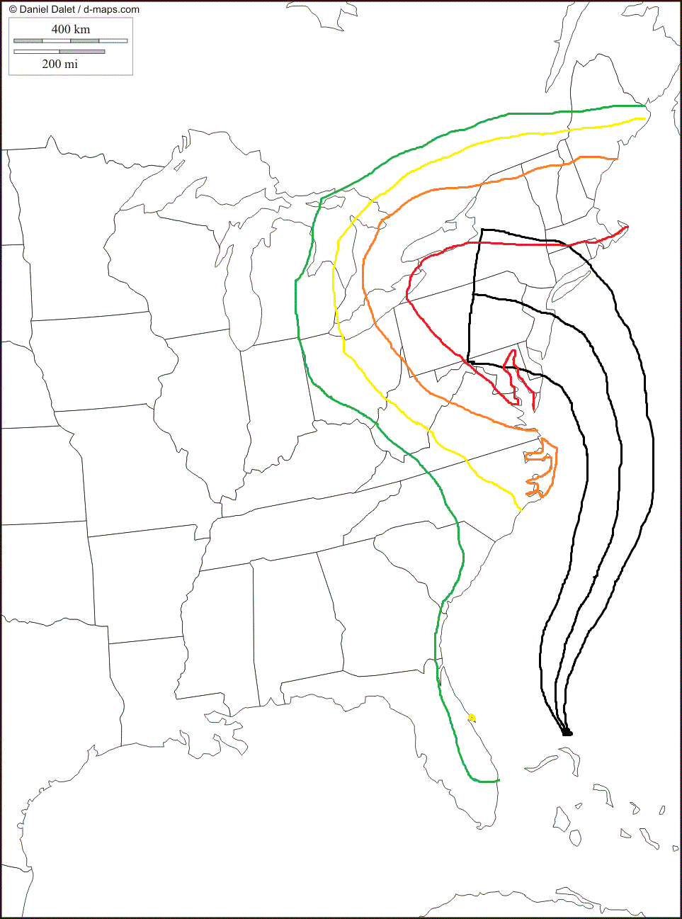 The HPC (Hydrometerological Prediction Center) forecast for rainfall. This is in connection with the NHC track so these 15″+ amounts might stretch farther north into NJ and NY. Also, this is only to Wednesday, it will be raining all the way through Thursday for parts of Northern New England.