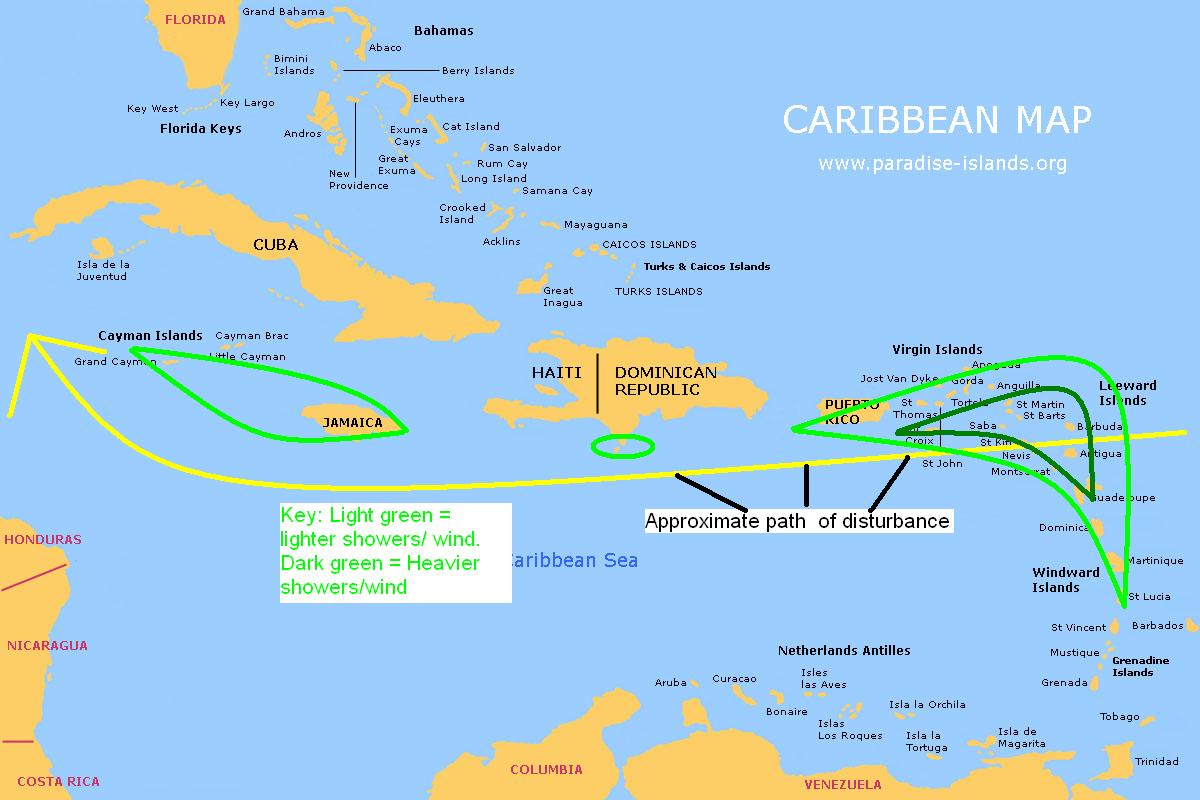 This is where I expect the storm to track through the next few days. However, uncertainties still abound and this map will likely change significantly in tomorrows update. The Northern Windward’s and Leewards should expect heavy rains and high winds from this disturbance.