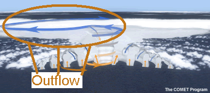 This graphic shows some of the things that 97L needs to work on. Lets start at the top left. This box indicates an outflow cloud-for lack of better word- which forms when thunderstorms collapse inward and generate a massive burst of wind known as a mirco or macro burst depending on the scale. This sudden release of energy containing cool air from aloft spreads along the surface there warm, moist air resides. The clash of warm and cool creates a cloud.