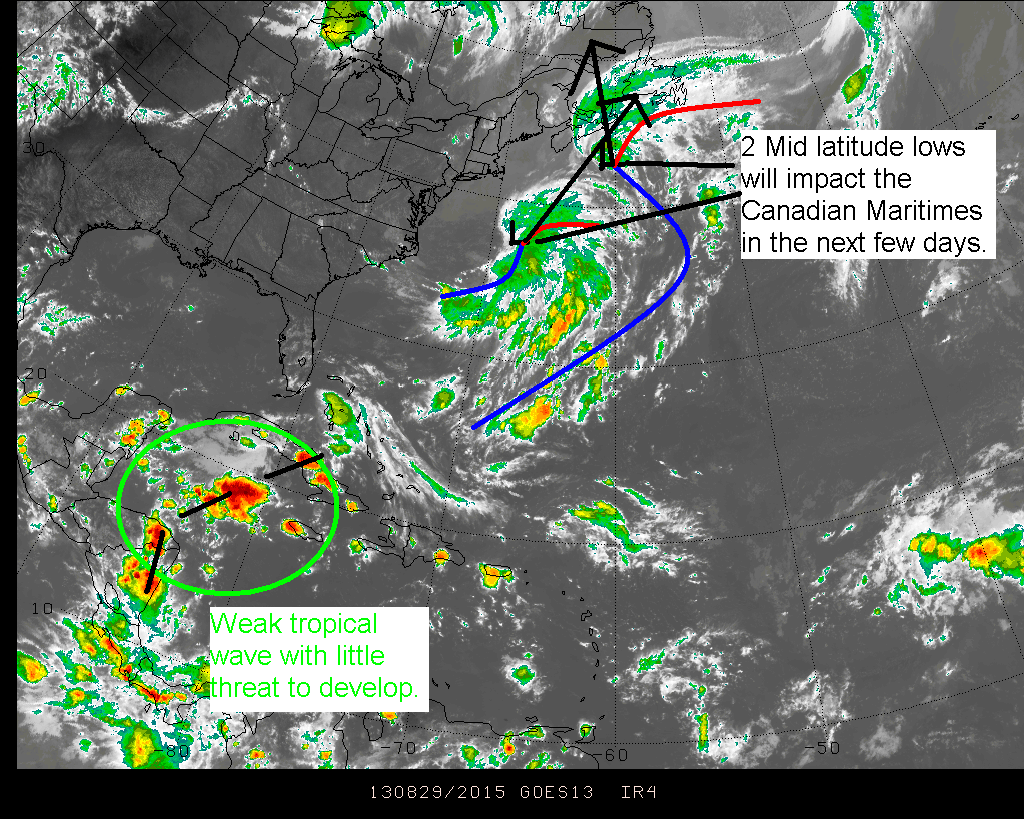 This graphic shows the satellite imagery on the top and the microwave imagery on the bottom. On the bottom, I’ve highlighted the heaviest thunderstorms in black and the center in red. as you can see, it’s a lopsided storm with all the convection to the western side. this is caused by strong upper level winds out of the east. The track and intensity model side is down as I write this do I will not be able to display those graphics at the moment but hopefully it will be back online tomorrow. The forecast from the other models look the same as yesterday, out to sea (OTS) as an open wave. This is the forecast I will stick by as well.