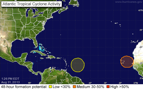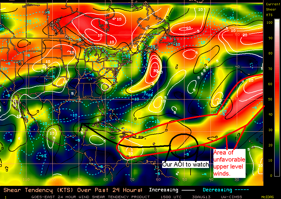 However, DMAX will greet the system bright and early tomorrow morning and will allow for significant return of convection to the system. There is a modest amount of spin associated with this system and with a bit more convection (may happen tomorrow or Labor Day), it could reach TD status. However, there are a few factors suppressing development and one of those is shear.