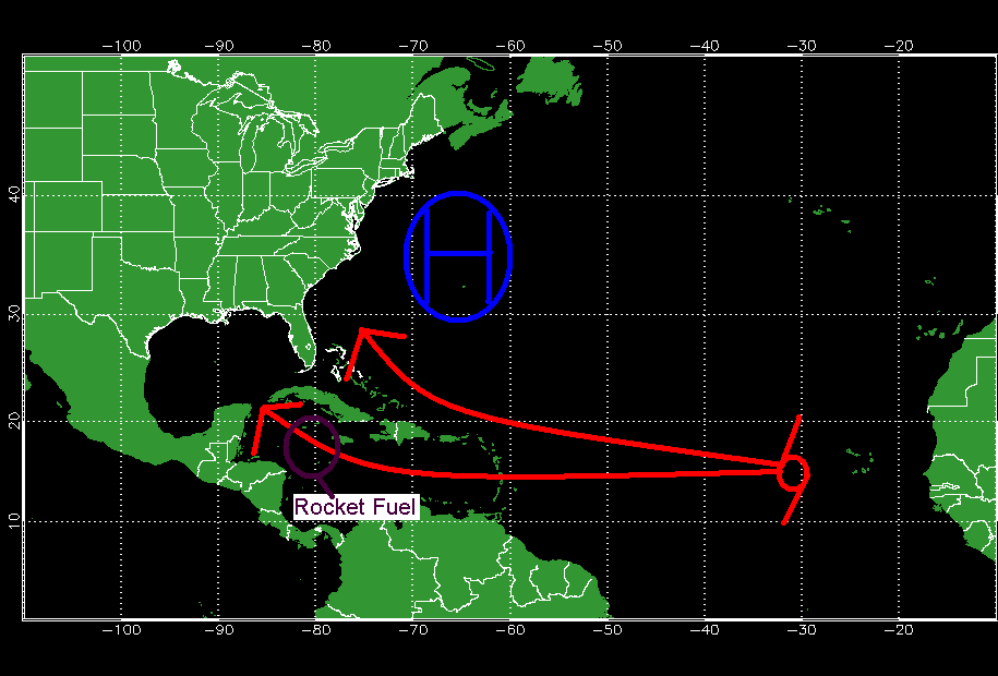 This map show the shear (highest=red, decreasing to black, the lowest) I highlighted 96L in the red circle and its expected track shown as the red arrow. Also highlighted is the problematic area of high shear outlined in black.
