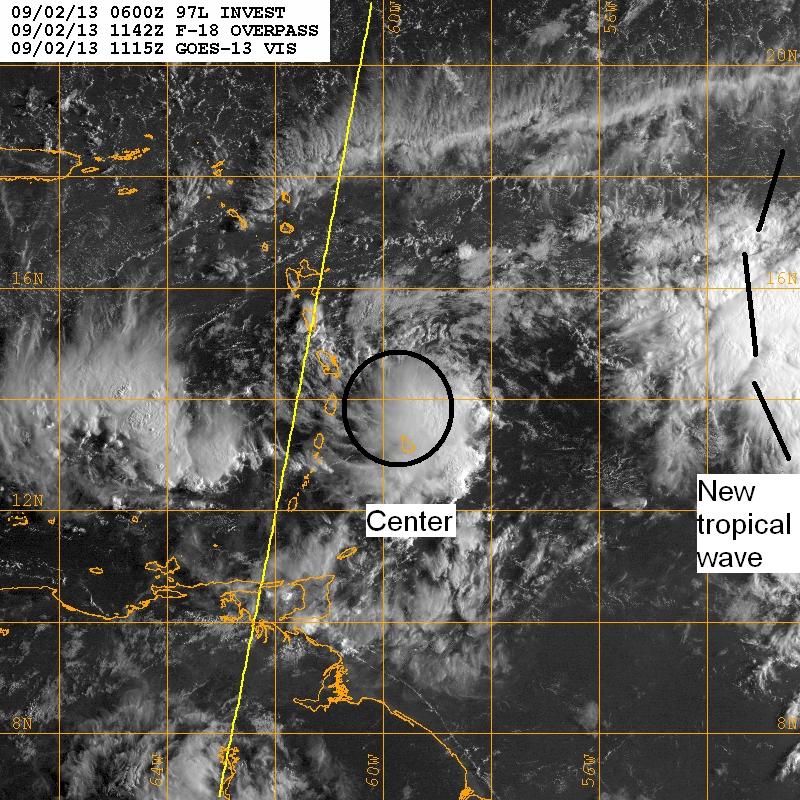 Overnight the diurnal minimum, the time of day when the sun’s energy is the least really took its toll on 97L. The storm lost most of its heavy thunderstorm activity as shown by satellite imagery.