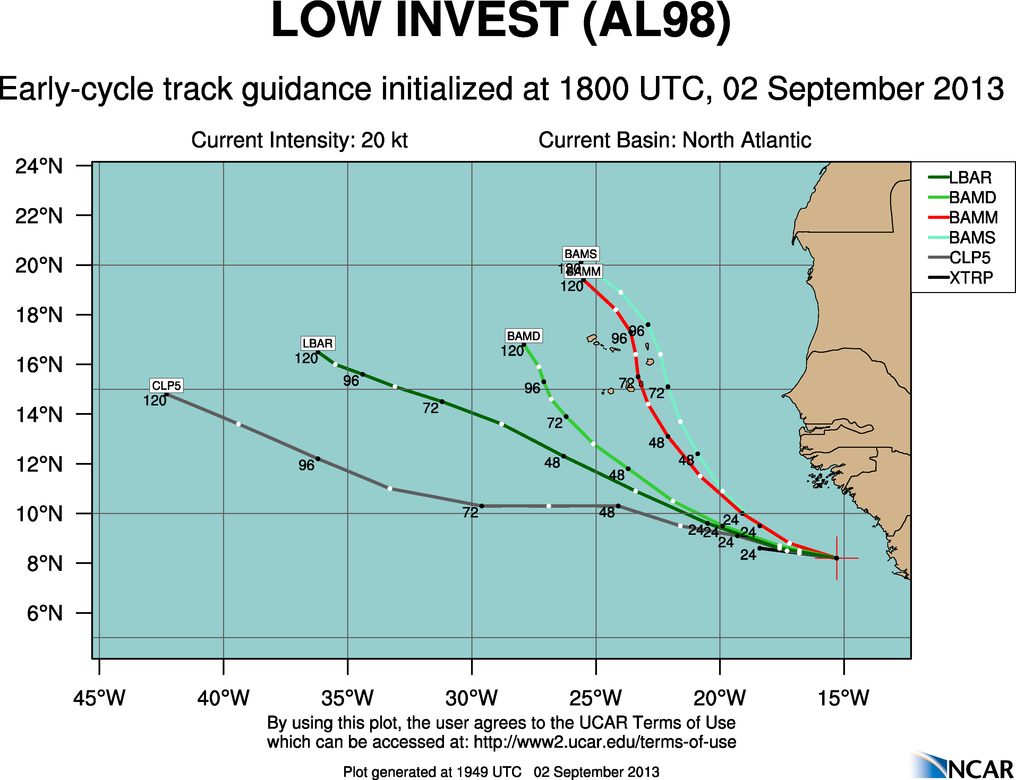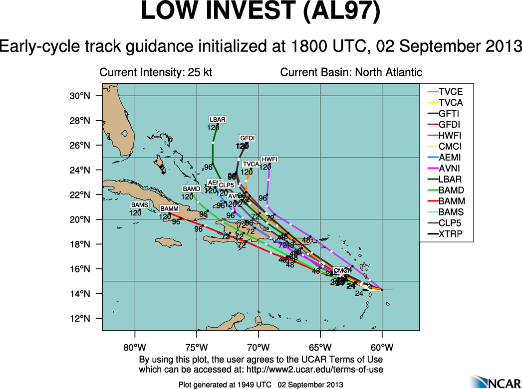 This map shows what the models think of the track of 98L. Notice that since 98L is much better organized than 97L, models forecast a sharper northward turn.