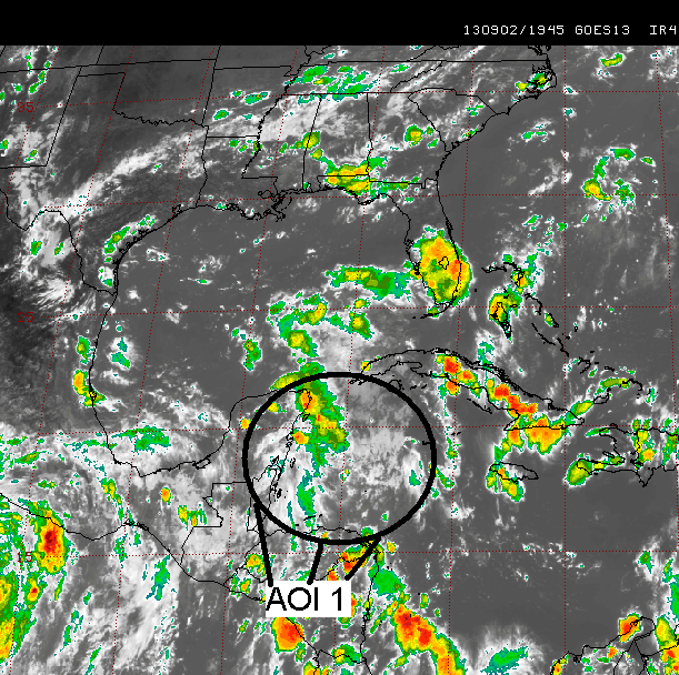 This map shows AOI 1, a disorganized tropical wave with little chance of development in the next couple of days. Where we have to watch it is when it moves into the Bay of Campeche. This area is notorious for spinning up tropical cyclones rather quickly because of the topography of the area.