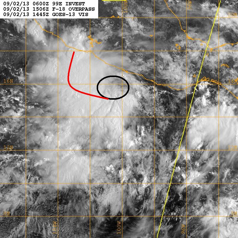 In this graphic, I’ve highlighted the center in black and a developing spiral band in red. The storm has good outflow channels in all directions and plenty of convection which is well organized. Now all it has to do is organize an LLC and it will become the 12th depression of the Eastern Pacific hurricane season.