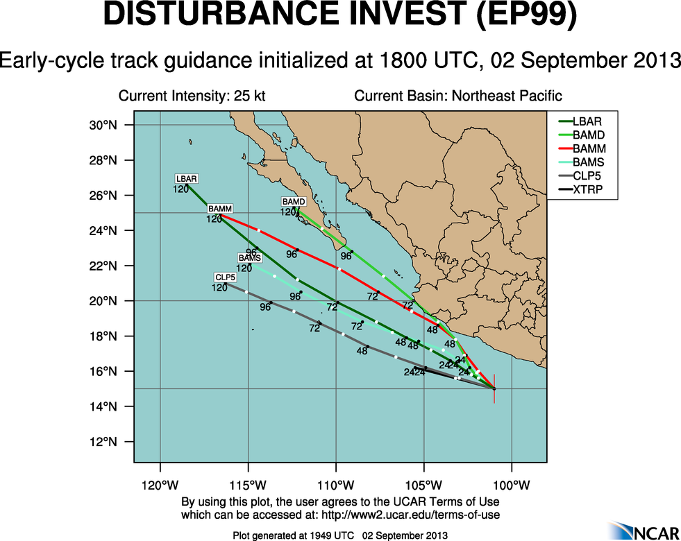 I think that the hurricane models have it nailed here. Monsoonal flow that is bringing flooding to the Southwestern US will likely suck 99E to the north like it did to KIKO a few days ago. I expect the only impacts on land will be widespread rain across northwestern Mexico and the southwestern US.