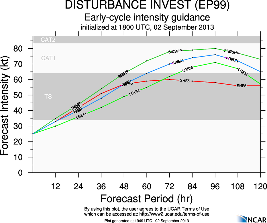 This map shows what the hurricane models think of the intensity of 99E in the coming days.