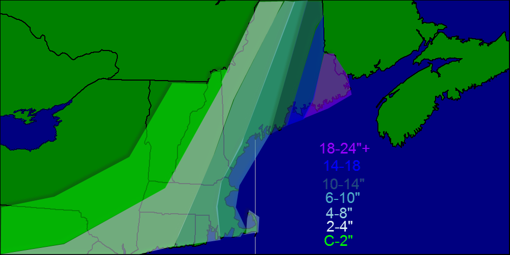 Regarding amounts, due to the fact that this storm is moving so fast, expect totals to increase the farther east you go. As of now, 6-10″ is a safe bet for Portland and Augusta with amounts likely toward the 6″ part of the scale. Upwards of 2 FEET is expected over Downeast Maine.