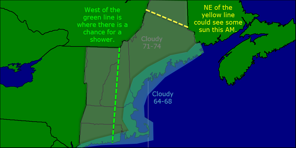 Today will feature more of the same with partly to mostly cloudy skies and the slight chance for a shower inland. Highs will be in the 60’s at the coast and in the 70’s inland. The best chance for clouds and showers will be over western areas like VT, Western MA/CT.