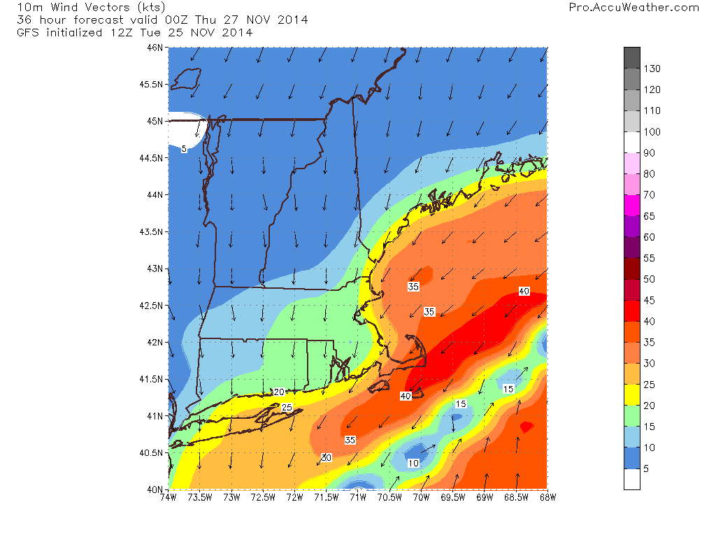 GFS model IDEA on wind speeds for 7 PM Wednesday. Note, speeds in Knots not MPH.
