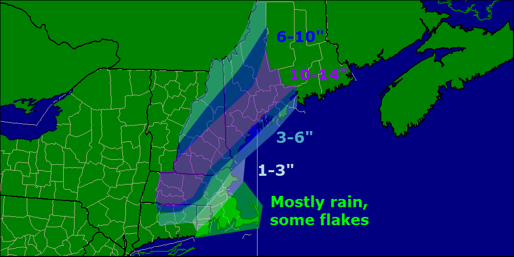 As confidence has increased regarding moisture/presence of cold air, 10-14″ zone was added. I still think midcoast Maine mixes a little bit and wetter snow overall holds down totals generally along coastal Maine. That being said, I still think that with lots of upward motion and dynamic cooling, the coast can do well in this storm.