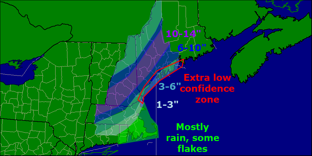 Should temps be a little chillier at 650mb or the switch to snow happen a little faster, coastal areas could pick up more snow. Should a warm layer work in aloft and the coast flips to sleet or columned snowflakes, totals go down. That is why I have highlighted coastal Maine as ‘extra low confidence’. That’s not to say I am super confident about the rest of the area, I just want to put it out there that bust potential is high.
