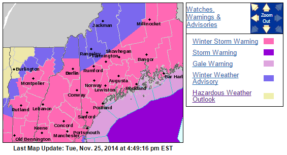 After a few days of much excitement, we can catch a break today with quiet weather. Overall quiet conditions are expected today with mainly clear skies along the coast, and some clouds and flurries possible in the mountains. Highs will be in the 20’s for most, 30’s coast and south. Winds will start out brisk but will diminish as the day goes on. Have a great Thanksgiving everyone!