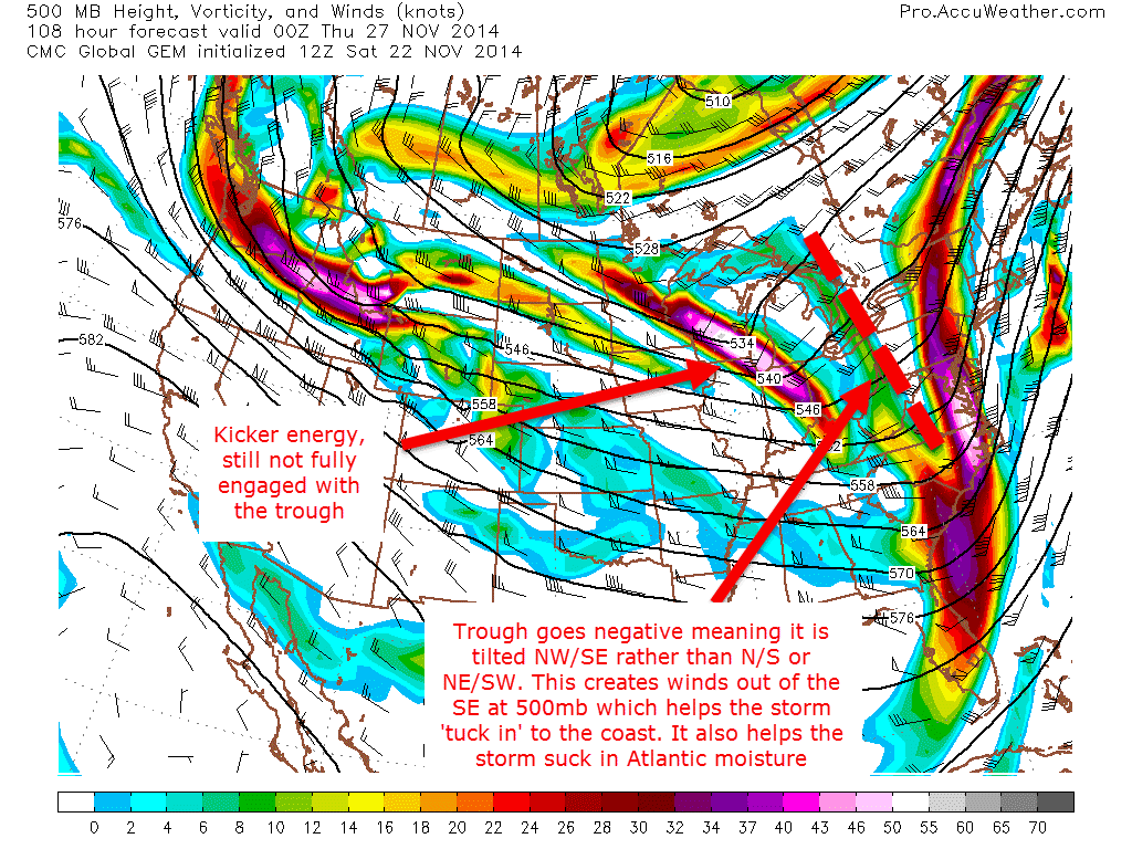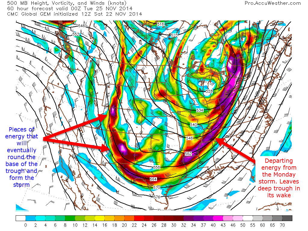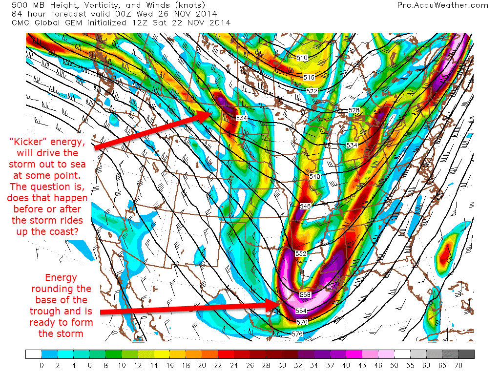 These three images show the path of the energy at the 500mb level (about 30,000 feet). The other important factor to consider especially regarding track is the frontal boundary that passes through the region on Monday will stall offshore and eventually end up helping both form the storm and then eventually help guide it up the coast or out to sea.