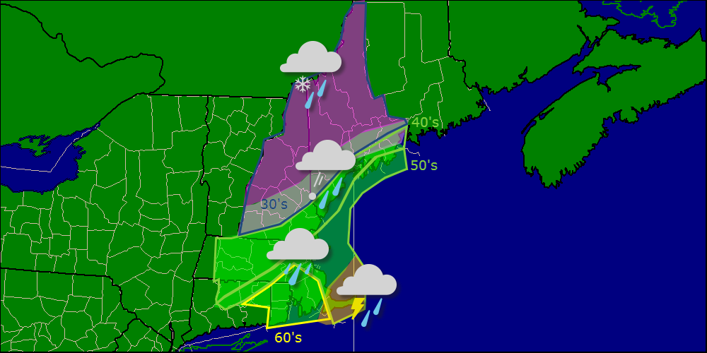 Lots to talk about this morning as low pressure works its way through the region. Expect a rainy day across coastal areas with a brief period of snow right about now. No snow accumulations are likely at the coast although 1-2″ of rain is expected along with winds gusting over 30mph. Anywhere south of Kittery Maine with the exception of the Berkshires sees all rain and parts of SE MA could see over 2″ of rain. A rumble of thunder is possible on the Cape with wind gusts near 60mph.