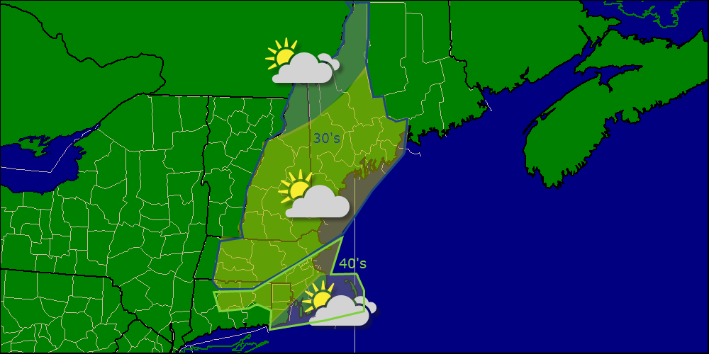 Today will feature mainly clear skies with noticeably cooler temps as the cold front that brought yesterday’s drizzle and fog moves well offshore. Behind the front today, we will see partly cloudy skies along with cooler temps, highs will not get above 40 in some of the high terrain as well as northern areas. Some more clouds move in this afternoon ahead of our next system.