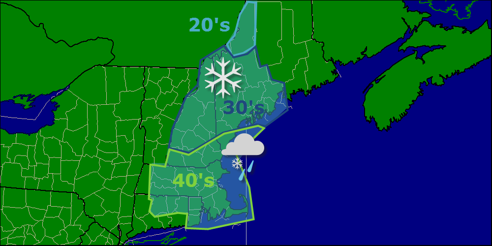 Mon/Tues: Mostly cloudy skies with temps mainly in the 30’s. Flurries possible along the coast. Generally