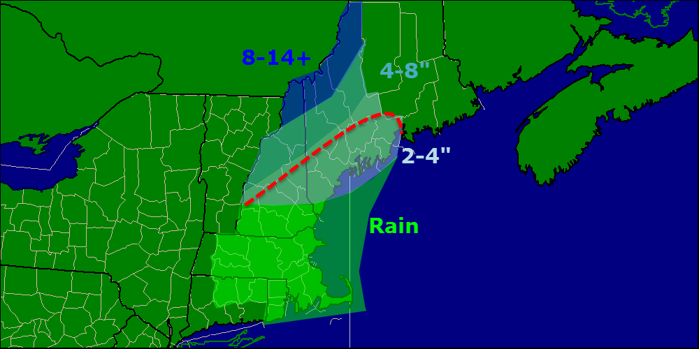 There will be lots and lots of rain with this one, no question about it. Expect amounts in the 2-4″ range for Coastal Maine and New Hampshire as well as most of MA and CT as well as all of RI. This is a pretty straightforward forecast and confidence is moderate-high.