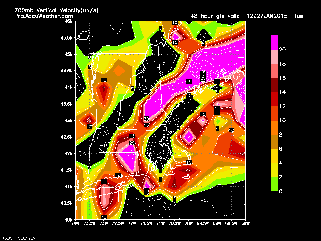 Here is the GFS vertical velocity map for 7 AM Tuesday. What you should take away from this very complex map is that red/purple = extremely heavy snow. Bands of snow falling at 1-3″ per hour will rotate through the region Tuesday morning and sticking around through the day Tuesday into Tuesday night.