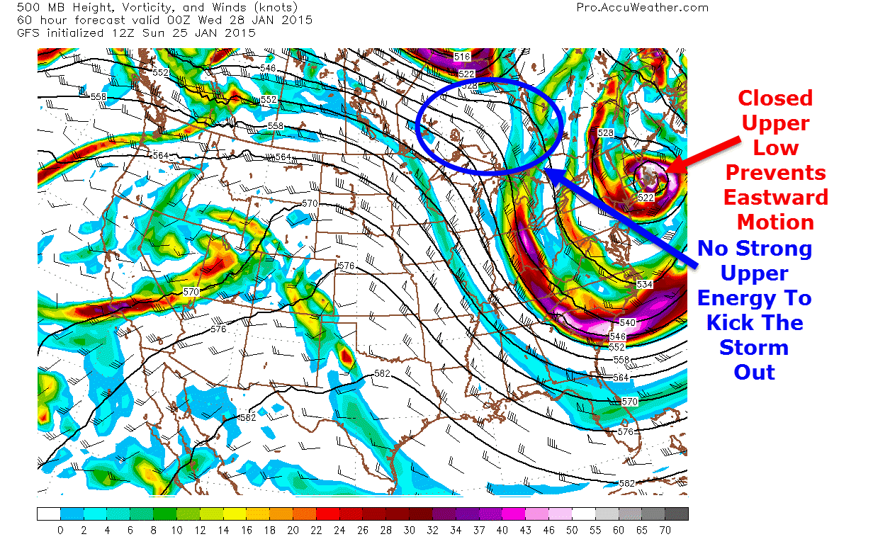 Why will this storm stick around so long? A combination of complex upper air phenomena will allow for the storm to stall off the coast for about 12 hours on Tuesday swinging band after band of snow into the region.