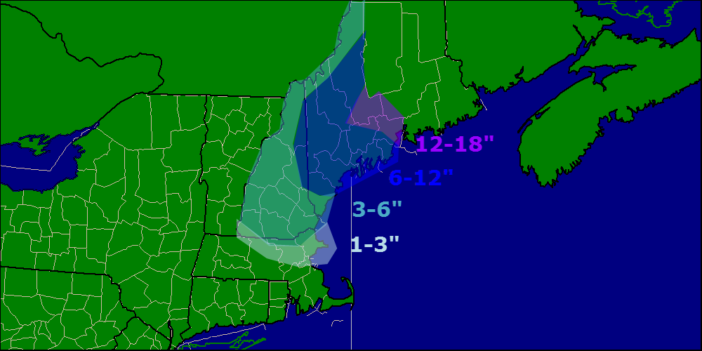 Here are the official watches and warnings from the NWS in Gray, Maine showing a large area under blizzard warnings with the remainder of Maine and most of New Hampshire under Winter Storm Warnings.