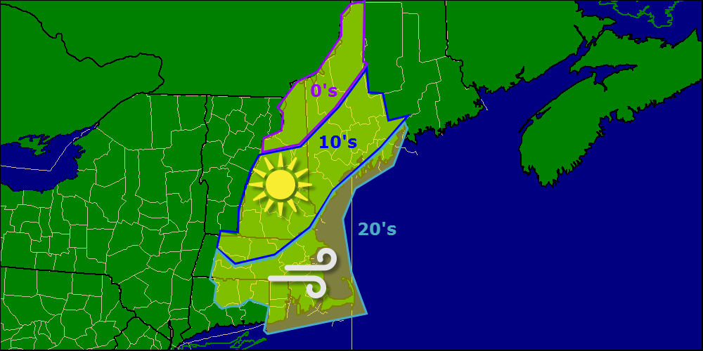 Today’s forecast can be summed up in one word: cold. With Canadian high pressure in place, expect a mostly sunny day with highs in the single digits above or below 0 in the mountains and in the 10’s at the coast. Brisk northerly winds will make it feel even colder today with widespread subzero wind chills.