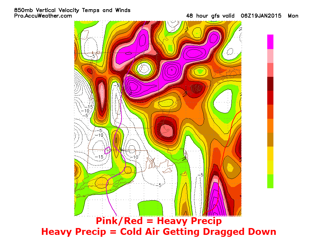 On the backside of the storm, intense upward motion, as seen here on the GFS’s vertical velocity map, will cause cold air aloft to be dragged down to the surface through dynamic cooling. All those big fancy words to say that the mountains are likely to see a quick shot of snow Monday morning that could drop an inch or two of snow. All in all, this won’t be a big snow producer but there will definitely be some flakes flying.