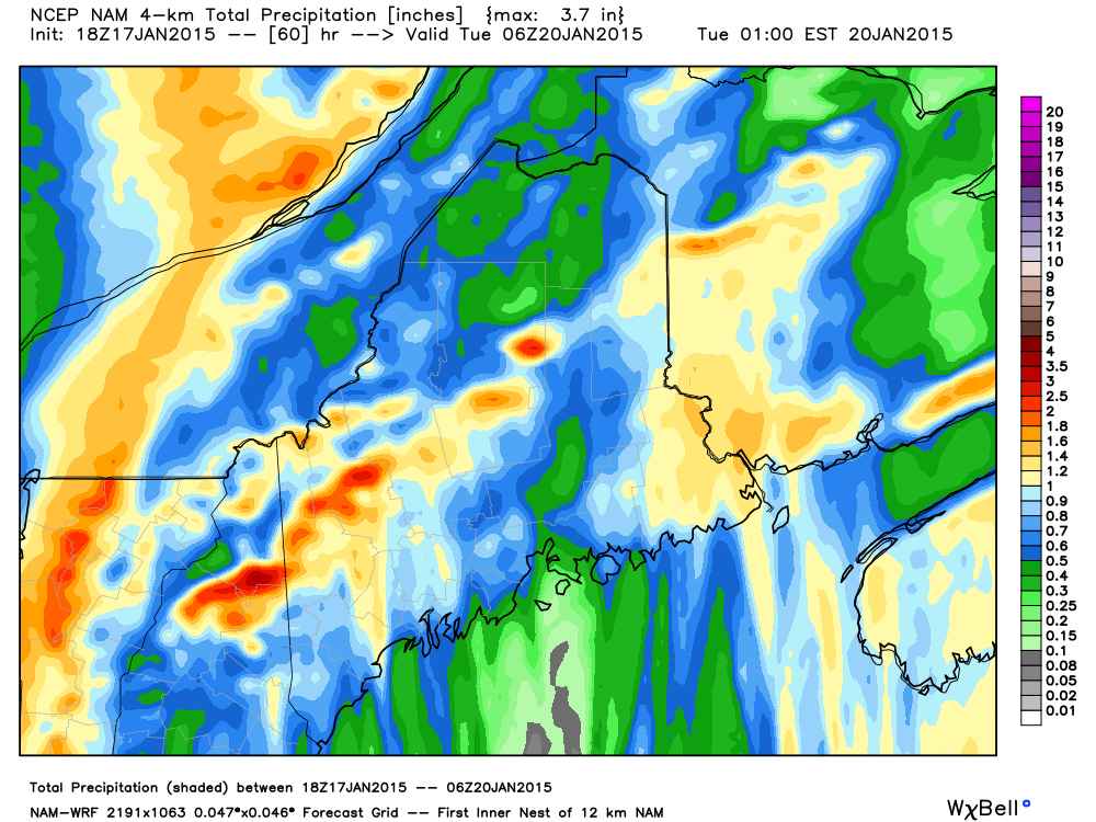 The peak of the storm will arrive tomorrow night as the low moves overhead. Rain will be tapering off over SNE as the storm moves north and the core of the rain moves to Maine. As the storm intensifies, dynamic cooling will cause the snow line to begin to collapse eastward beginning around 2-3AM. The cold will race the precip as the dry slot works in, beating the end of the precip in the mountains especially in NH. The cold arrives a little late for the foothills and the coast.