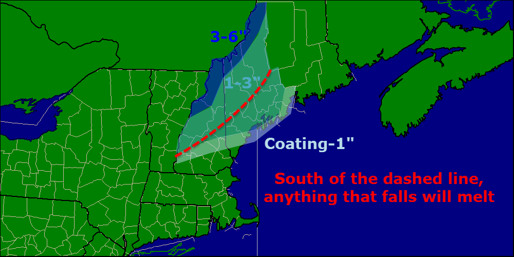 There will be two shots of snow with this storm, one at the beginning and one at the end. Very light snow at the beginning could drop a coating-2″ for most places. South of the red dashed line on the map, that’s all the snow that will fall and it will melt pretty quickly with the rain.