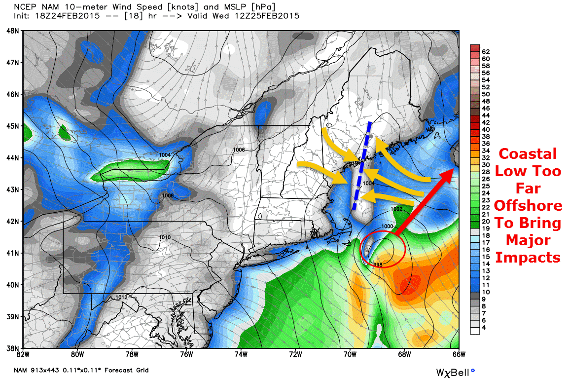 18Z NAM Showing A Distinct Wind Shift Line (Orange Arrows/Blue Dashed Line) Over Midcoast Maine At 7 AM Tomorrow. Credit: Weatherbell