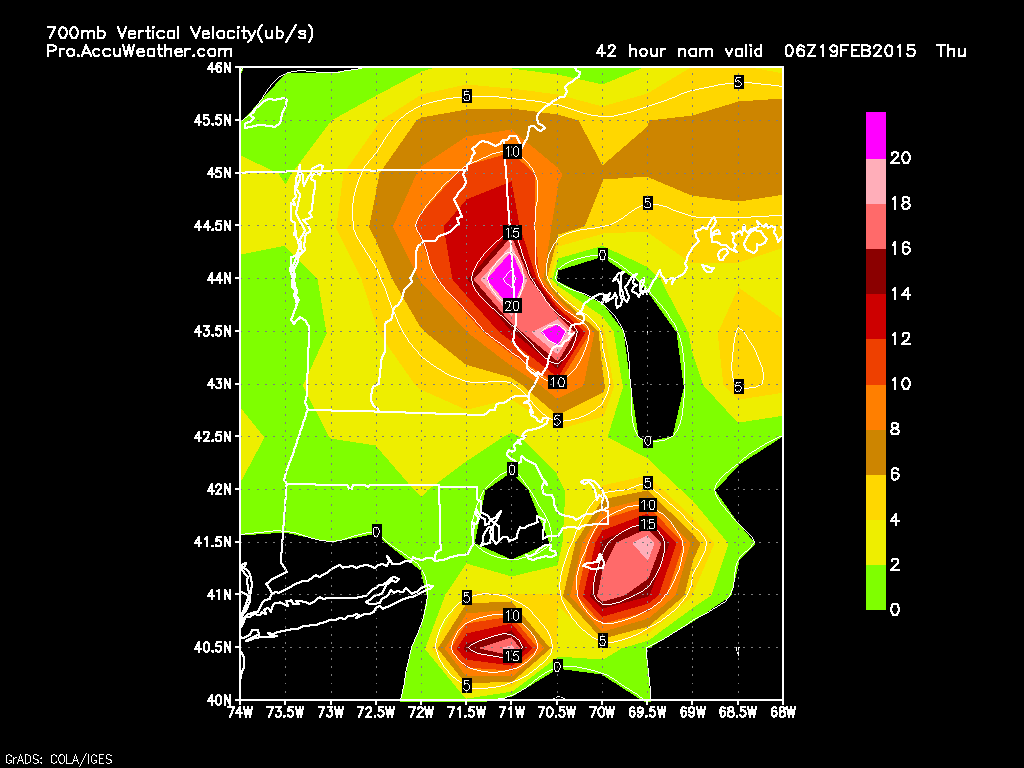 Another supporter of heavy snow bands comes from the intense upward motion brought on by the mesolow and the wind shift line. The GFS model (shown) suggests the most intense upward motion to be between Portland and Brunswick and inland from there while the NAM has it farther south over York county and points inland.