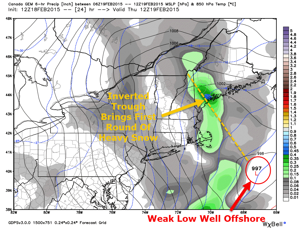 The first phase of our storm will involve the development of an inverted trough. While this is similar to a Norlun trough, a true Norlun event would involve a stationary band of snow whereas this band will likely move slowly east with time. Therefore it will be referred to as an inverted trough for this event.