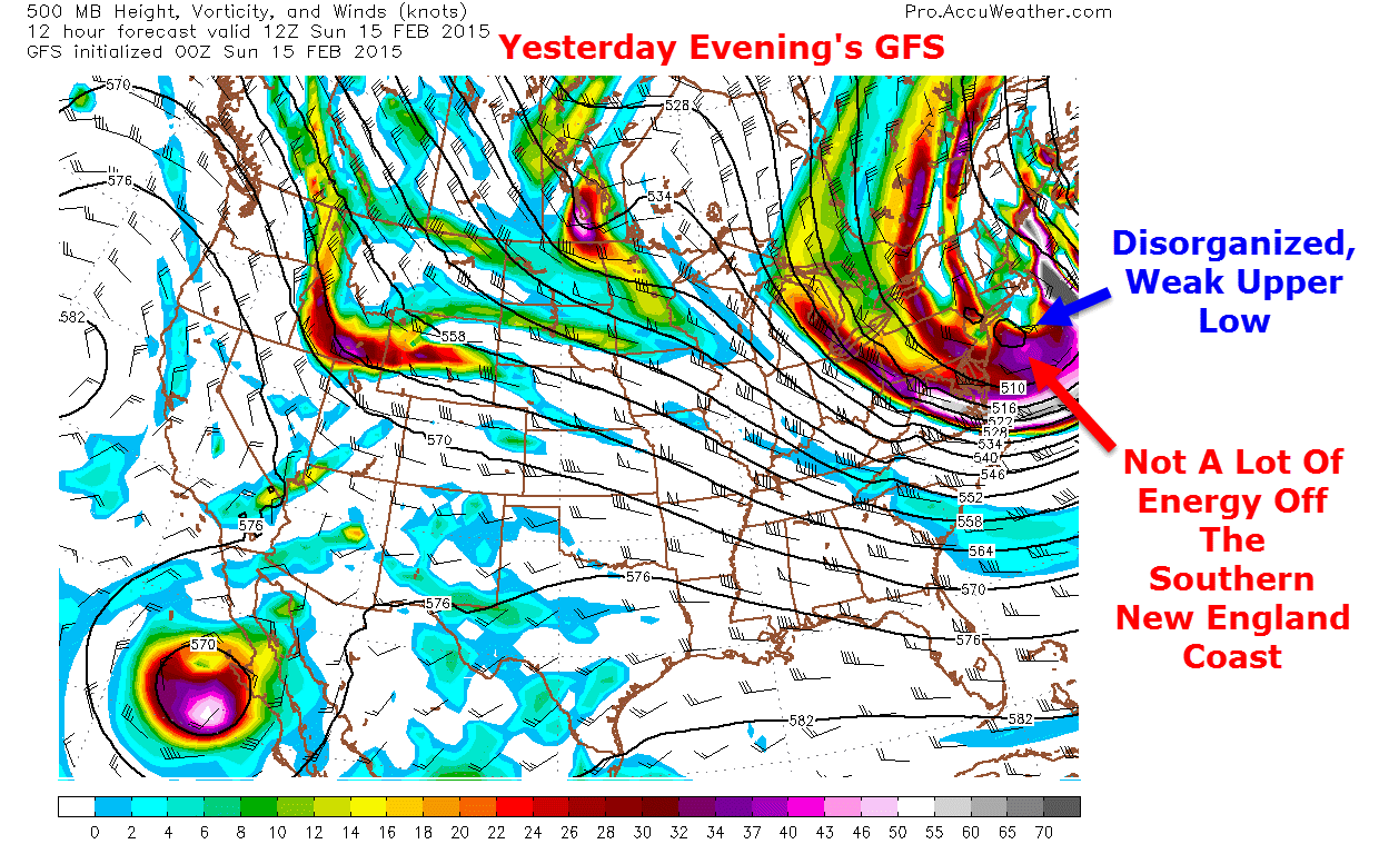 Yesterday morning the blizzard forecast was on. Models predicted a strong and strengthening upper low off NYC with tons of energy off of Southern New England. All this energy would translate into a strong and rapidly strengthening storm and thus lots of snow was predicted.