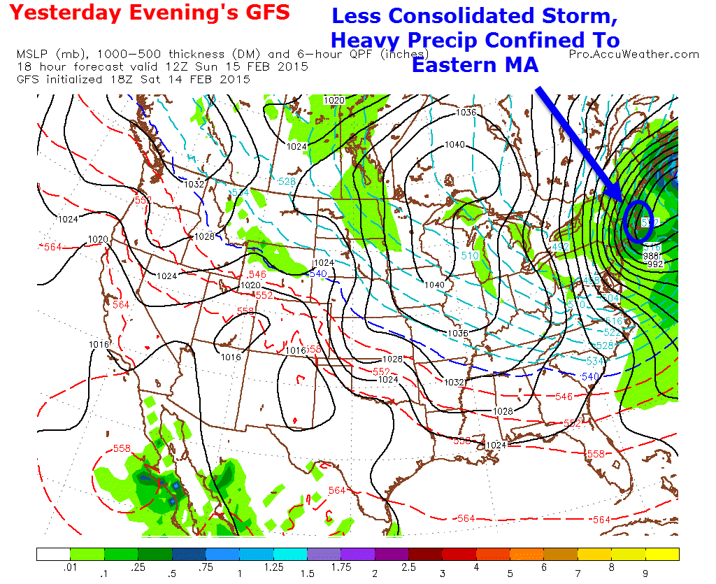 Once again, yesterday’s models changed their mind. Notice the lack of the pinks and reds in yesterday’s evening run. Without as much fuel, heavy bands were confined to very small areas (Boston and York County) while the rest of us saw flurries. Bands down in Boston even caused thundersnow however the tremendous amounts of energy that was used up by those bands came at the expense of other areas of heavy snow that were trying to form last night.