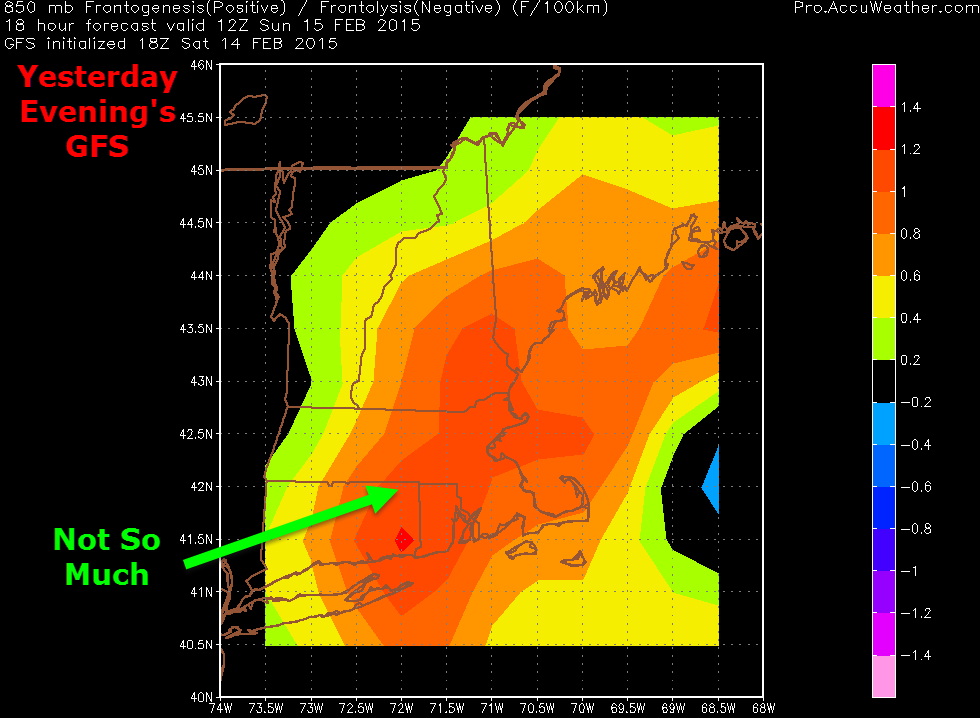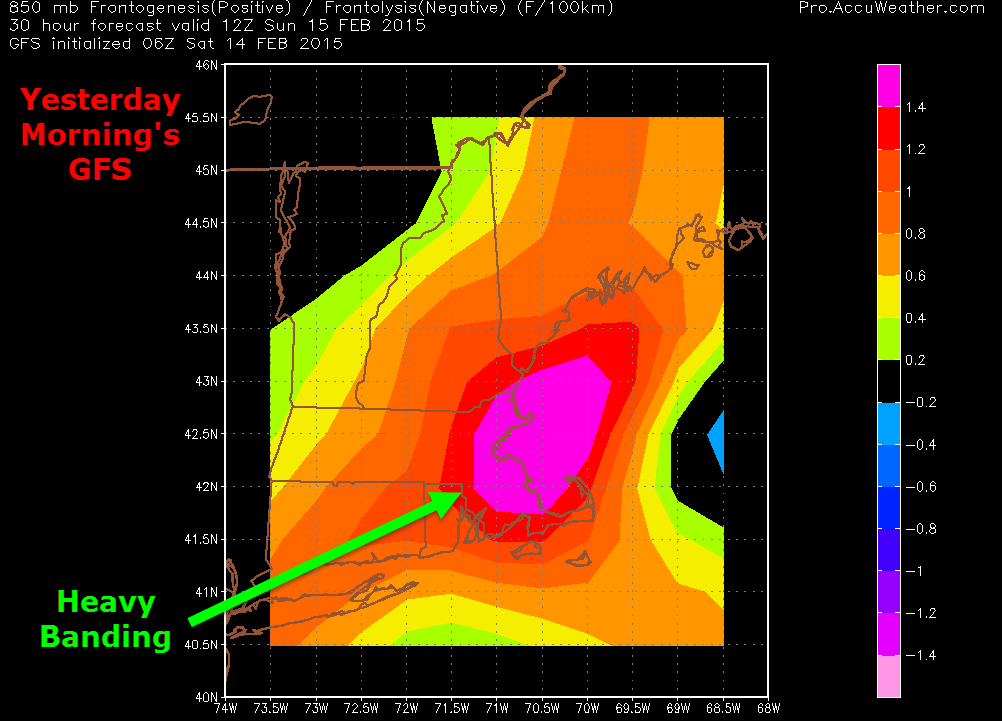 Here is yesterday morning’s GFS showing lots of frontogenesis across the area. Frontogenesis can basically be thought of as fuel for heavy snow bands. Lots of frontogenesis (shown above) creates lots of heavy bands. This was yet another factor that contributed to what was a high confidence forecast for blizzard conditions and lots of snow.