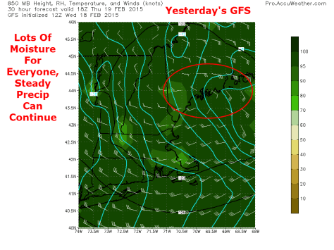 Now let’s look at the surface map from yesterday’s morning run. notice all the dark greens in the blue circle showing heavy snow. Without upper air support, those couldn’t happen. Yesterday’s evening run finally picked up on that and showed any dark green confined to Eastern MA.