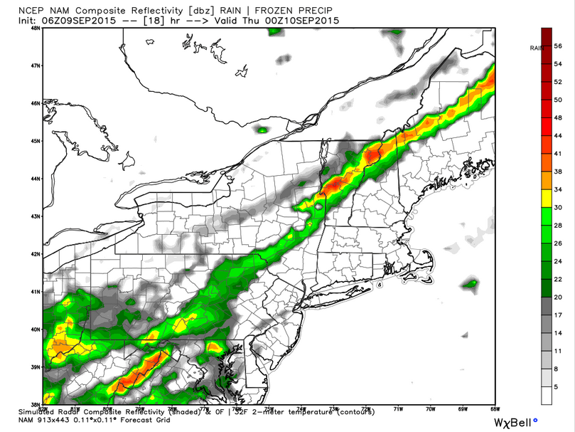 For the mountains and NH, the front does indeed look to get close enough this evening to provide enough forcing for storms to get off the ground. I’d be looking for storms to begin moving into the area in the vicinity of 4PM and continuing SE from there. Storms will be weakening so severe weather is not anticipated but the mountains should watch out for a few gusty winds in any of the stronger storms that make it this far. Heavy rain will be the threat region wide with any storms that do form.
