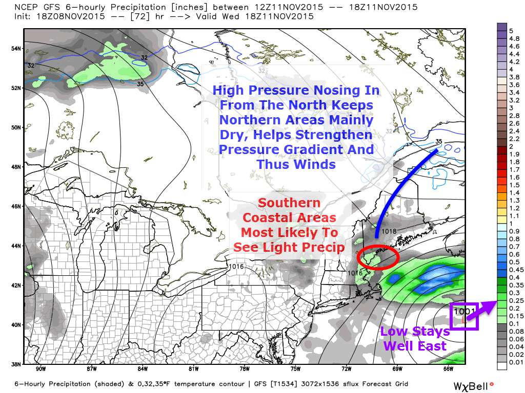 A low pressure system will develop offshore Tuesday and move NE up the coast but before it reaches Cape Cod, it looks to turn east and away from the coast. The upper level pattern is very conducive to this motion and the energy sparking this storm is very weak so it does not look to be a big storm. What is big though is the high pressure center up in northern Quebec/Labrador. A piece of this sprawling high will likely extend down into Maine which will help to create a respectable but certainly not impressive pressure gradient Wednesday which will lead to some gustier than normal winds. For northern areas, expect slightly breezier conditions and mainly cloudy skies but little/no precip. Coastal areas look to see breezy conditions with drizzle/showers likely. All in all, nothing intense but a dreary day nonetheless.