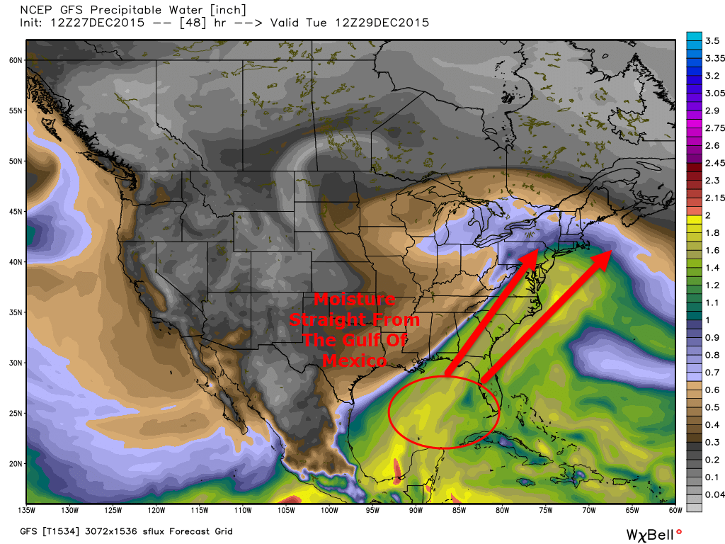 12Z GFS Model Showing Moisture From The Gulf Of Mexico Plowing Northward Monday Night. Image Credit: Weatherbell