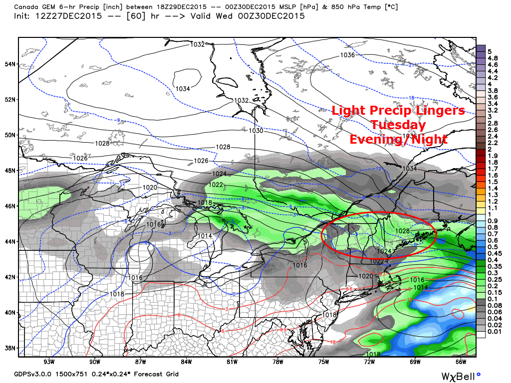 After the main snow event moves east Tuesday evening, lingering low level moisture will contribute to light mixed precip lingering through the first half of Tuesday night. As warm air completes its invasion aloft Tuesday evening, this could fall any of a number of ways, snow, sleet, freezing rain, or rain. The precip will be light so the impact on snowfall totals will be limited.