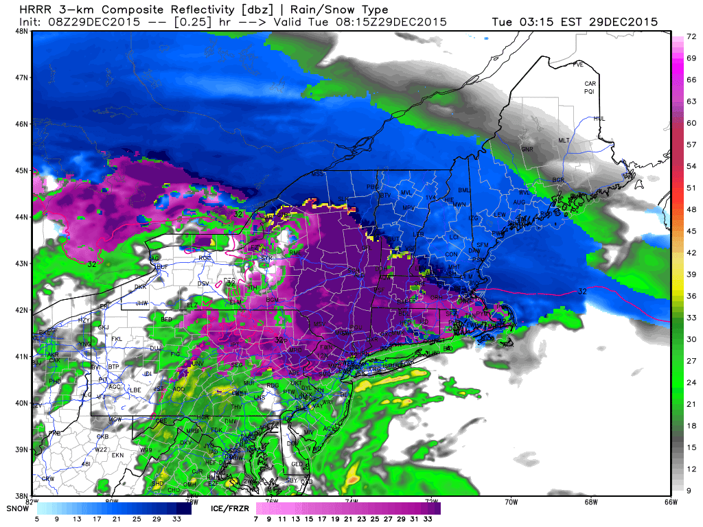 The other concern for precip type will be along the immediate coast where a coastal front is likely to form. There will likely be a tight temperature gradient along this front and if you end up on the SE side, temps could rise high enough to change the precip to a rain/snow mix. This threat is greatest along the coast south of Portland and along the tips of the peninsulas. Wherever this sets up, look just to the NW for heavier precip associated with the warm ocean air moving up and over the cold locked in at the surface. Warm air rising over cold air is what is causing this whole mess on a large scale, the same thing happens on a small scale.