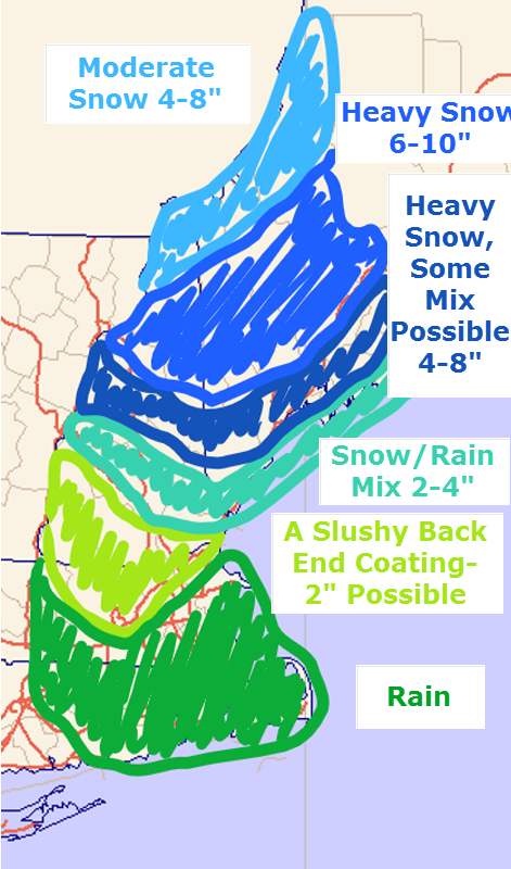 We’re still on track to receive a sizeable storm tomorrow as low pressure moves up the coast. The trends this afternoon have been towards low pressure being slightly farther east which would mean slightly cooler temps along with slightly less total precip. Overall, this leads to little shift in terms of how I think things play out but there are a few important differences. These differences mainly revolve around how things play out at the coast and just inland.