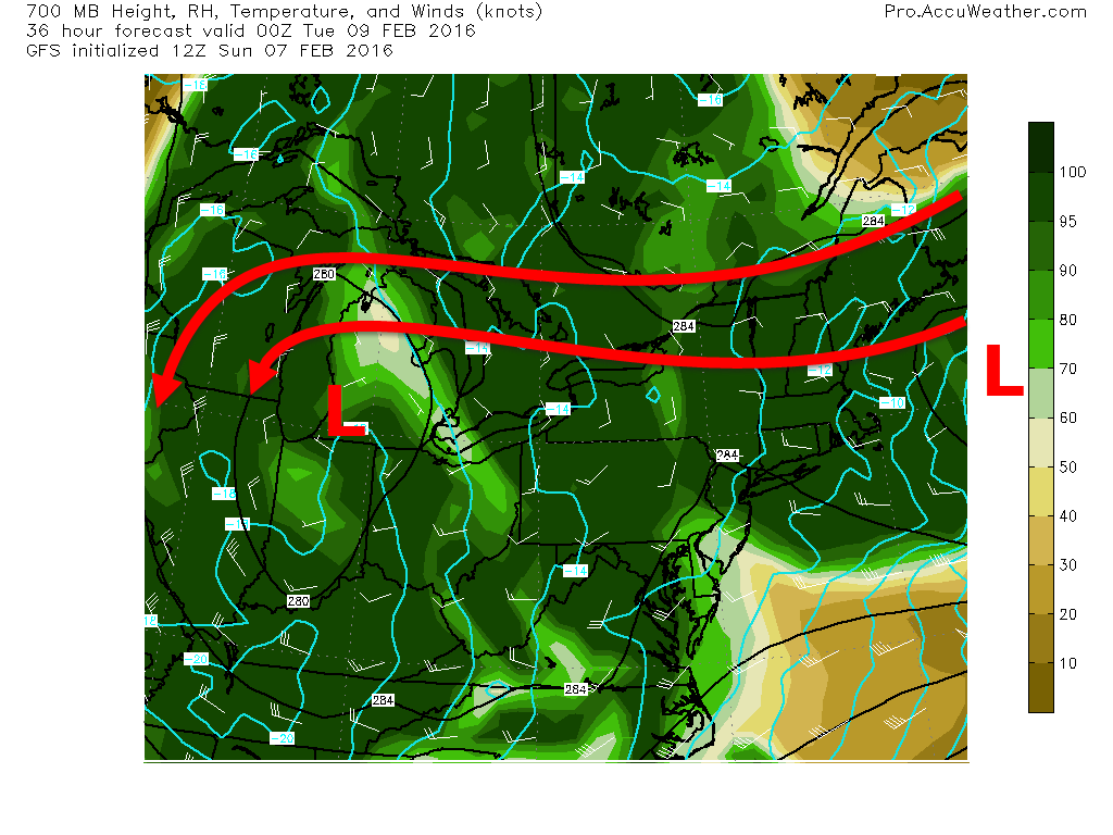 The coastal monster will stay mainly offshore but it will throw a ton of moisture back to the NW. There is a clipper to the NW which is ready to receive this moisture and will help draw it back NW. Bottom line: there will be a feed of moisture over the area tomorrow as moisture from the coastal low gets pulled back into the clipper. If you watched my video discussing the Friday storm, you know that we need three things for snow: moisture, cold, and lift. We got the cold today with that Arctic front and above is the moisture. The problem though is the lift.