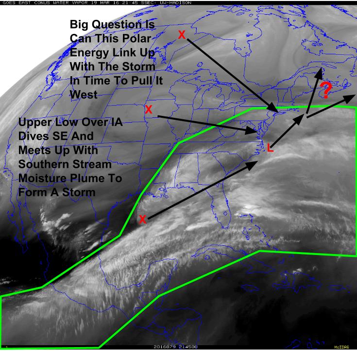 Water Vapor satellite imagery this evening shows all the parts of our storm. I’ve marked the disturbances and where the surface low will form and where it could possibly track (approximately). The ULL over Iowa is diving SE and will merge with a weak disturbance embedded in a deep plume of subtropical moisture which is marked in Green. Their interaction is beginning to form a storm over the SE US. When they merge, the storm will intensify a little bit as it begins to move NE. The real question has to do with Polar energy dropping down from the Western side of Hudson Bay. It has until Sunday night to get all the way to NY (about 1500 miles). It’s a race against time. If that energy crosses the finish line in time, it intensifies the storm, helps tilt the upper trough negative, and in turn wraps heavy precip back into our area. If it doesn’t, the storm continues at a moderately weak intensity ENE out to sea leaving us with but an inch or two.