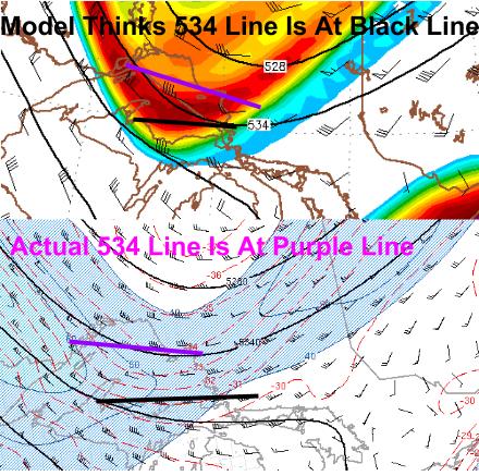 This is the comparison I’m talking about with regards to the energy blasting through the Great Lakes. Notice the disturbance (marked here by the 534 dm contour line). It is a little farther behind the NAM forecast. These images are valid at the same time (5PM this evening). This is the critical energy that, when it gets here, will tilt the upper level trough negative which will intensify the storm and bring it west. This happens just a little too late for us. Model guidance has backed off on snowfall amounts today, probably as they are sniffing this out. Given that even the most up to date guidance (18Z NAM used here) is too fast with this energy, I’ve opted to go even lower with my snow totals. Without the trough tilting negative, moisture cannot be wrapped west and precip won’t get much past the coast.