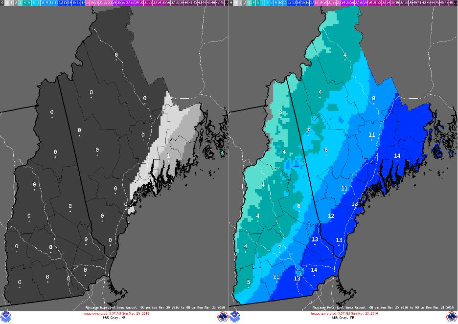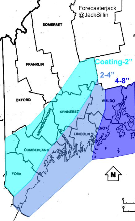 In terms of accumulation, this is what I’m thinking as of now. The Midcoast will see the most as it could get into the heavy bands and will be closer to the center of the storm. A sharp cutoff will occur somewhere near Brunswick but it will be impossible to pinpoint that until the snow is actually falling. West of that cutoff, an inch or so is expected while east of that cutoff several inches are likely. Areas near Camden/Rockland/Belfast are pretty likely to see more than 4″ and up to 6 or 7″ is possible should the banding set up right. Farther north and west, little is expected and the mountains could escape without a flake.