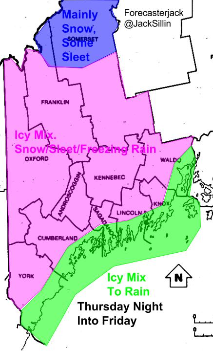 In terms of impacts, this one will be a mix of snow, sleet, and freezing rain for most of the area with the far north possibly holding on to mostly snow and the coast seeing a change to rain at some point. Everyone will see slick travel Friday during the morning commute and roads are likely to remain slick for the evening commute away from the coast. While it is still a little early to call exact amounts, I expect a widespread 1-3″ of snow with coatings along the coast and 4 or 5″ possible in northern Franklin and Somerset counties. In terms of ice accretion, light to moderate amounts are likely and in some areas, especially inland, it could be enough to threaten power lines. This does not however look to be a major ice event. With the storm weakening and possibly splitting, there does not look to be enough precip to cause major issues.