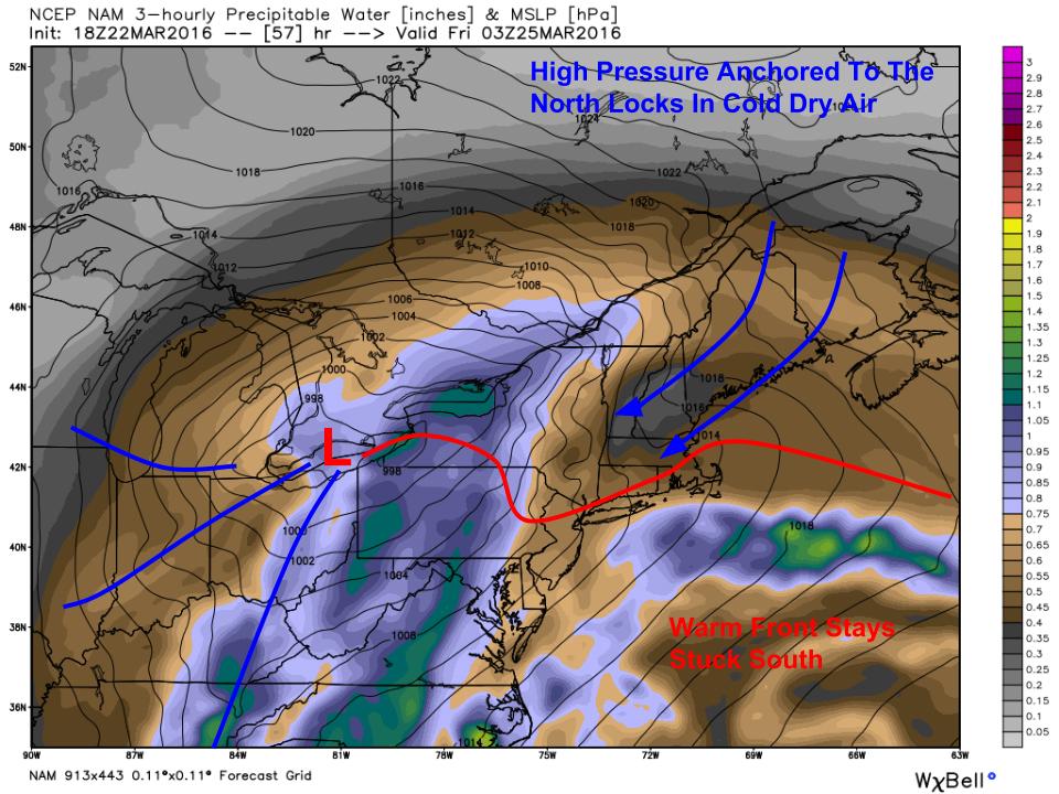 Here’s the setup late Thursday evening as low pressure approaches from the west. Cold, dry air will be in place shown by isobars bending over our area and shades of Grey appearing in the Precipitable Water (PWAT) fields. The scale on the right shows how grey colors represent low PWATs and thus dry air. The image also shows sea level pressure which shows high pressure anchored to our NE feeding cold air south. The wavy nature of the warm front also signals the lack of a concentrated push north of warm air as well as the potential for redevelopment of low pressure offshore. The secondary coastal storm is something that guidance is hinting at and with the strong high pressure trying to ‘split’ the storm in two, this seems like a reasonable possibility. This is unlikely to lead to a strong coastal storm and precip is likely to remain light to moderate through the duration but it would help to keep that cold air locked in across the area.