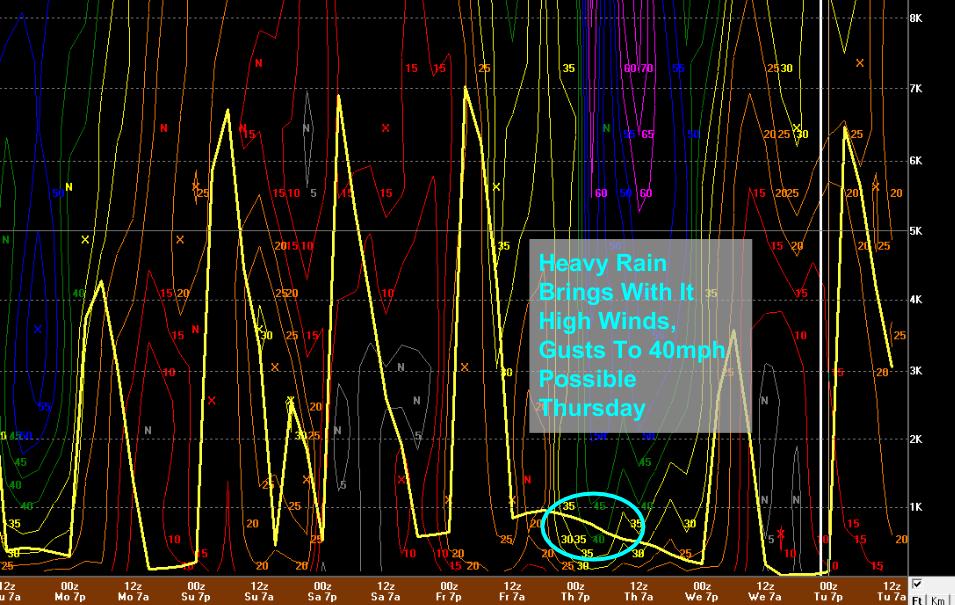 I just wanted to go over Thursday a little more as it looks to be a fairly dreary storm. It starts as snow for inland areas Wednesday night but will quickly go over to heavy rain by early Thursday morning. Heavy rain is likely through Thursday evening and 1-3″ is expected with the higher amounts over the SE facing terrain where a little upslope boost is expected. Winds will pick up as well as heavy showers tap into strong winds aloft. Gusts to 40 mph are likely.